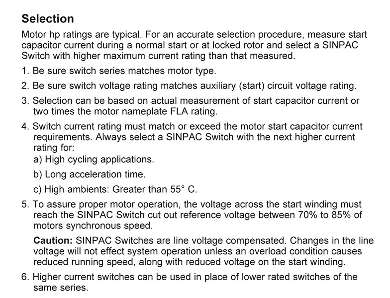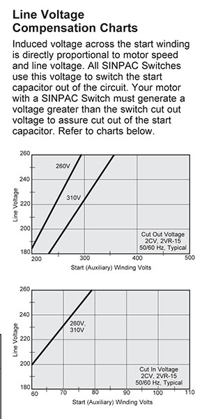Capacitor start/capacitor run motors exhibit current transients and higher voltages across the start switch. This electrical stress is due to the voltage differential which may exist between the start and run capacitors at the instant of switch closure. This stress phenomenon occurs with both mechanical and electronic type start switches. SINPAC® Switches have voltage detection circuitry to minimize the effects of these conditions.